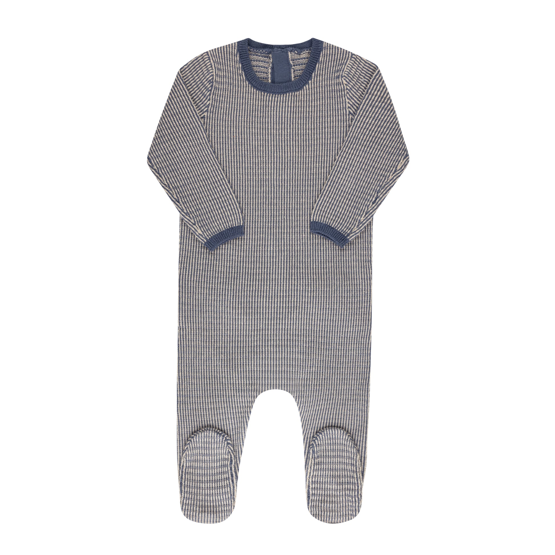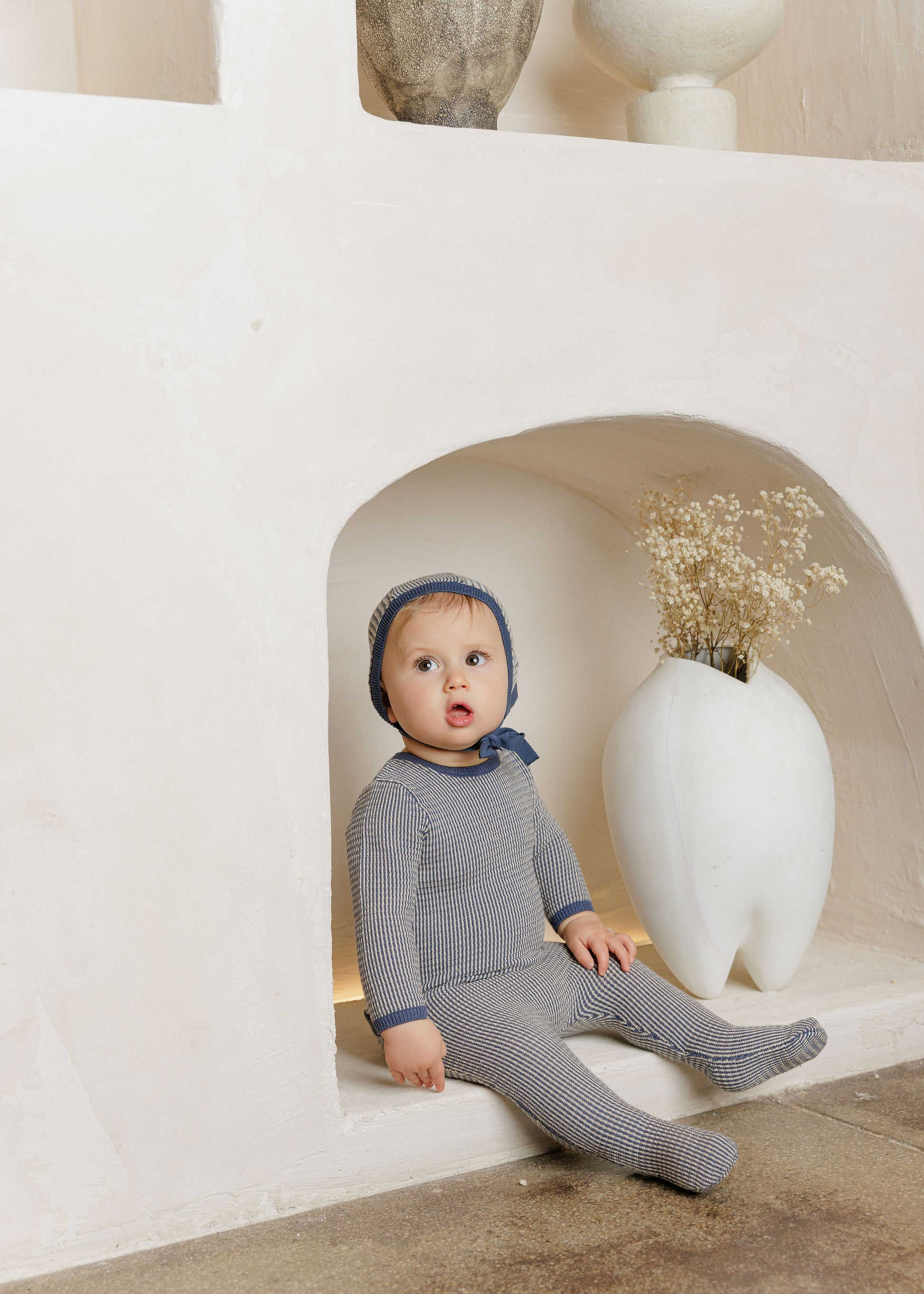 Wrap your little one in the cozy comfort of the Looms Blue/Ivory Thin Stripe Footie. Crafted from a gorgeous knit collection, its beautiful stripe weave adds a timeless touch to your baby's wardrobe. Soft and breathable, this footie ensures all-day comfort while keeping your baby snug and stylish. Perfect for everyday wear or special moments, it combines quality and charm effortlessly.