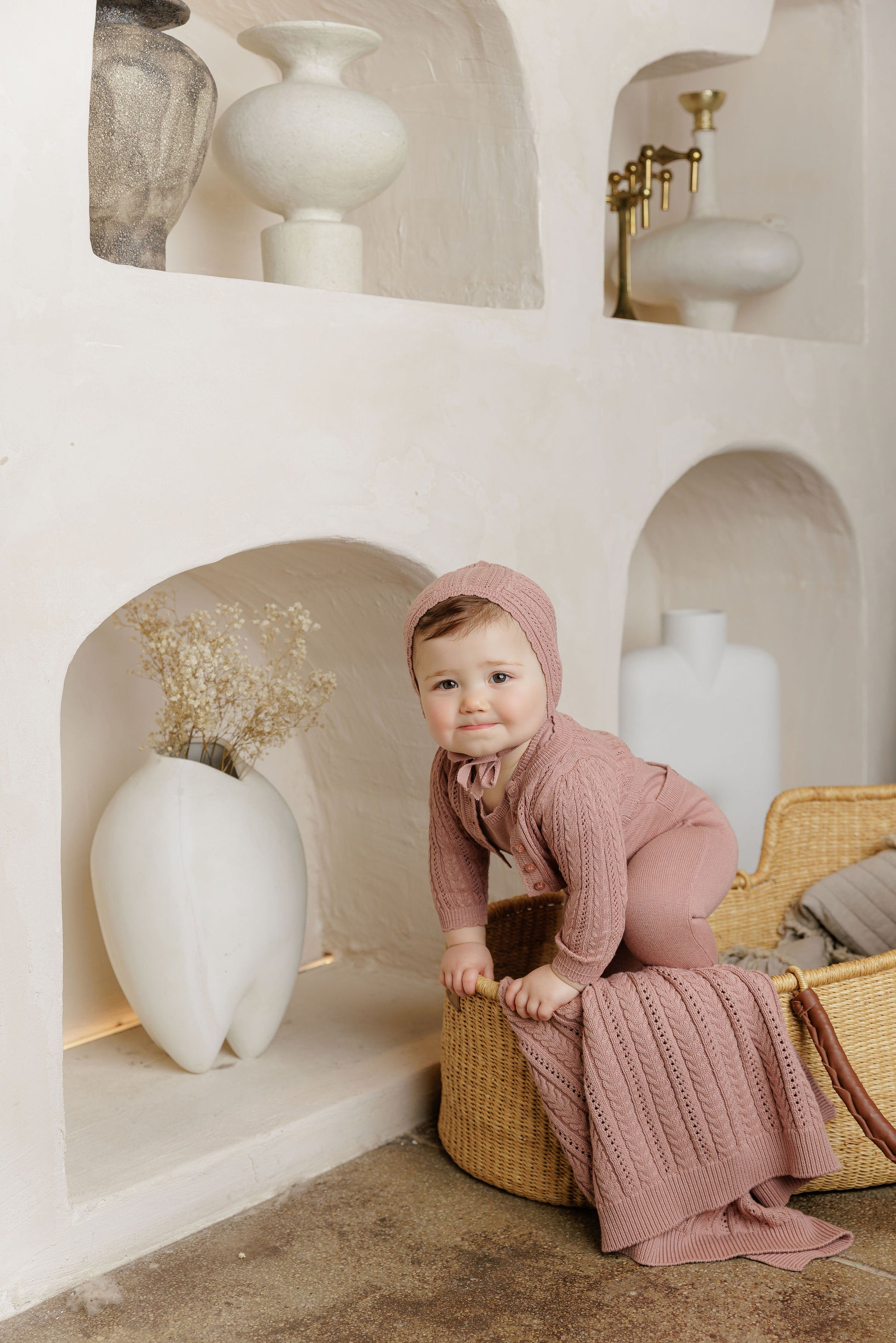 This delicate mauve footie features a fine knit that offers both comfort and style for your little one. Its lightweight design pairs beautifully with a matching cable knit cardigan and bonnet, creating an effortlessly charming outfit perfect for any occasion. Keep your baby cozy and adorable with this elegant knit essential.
