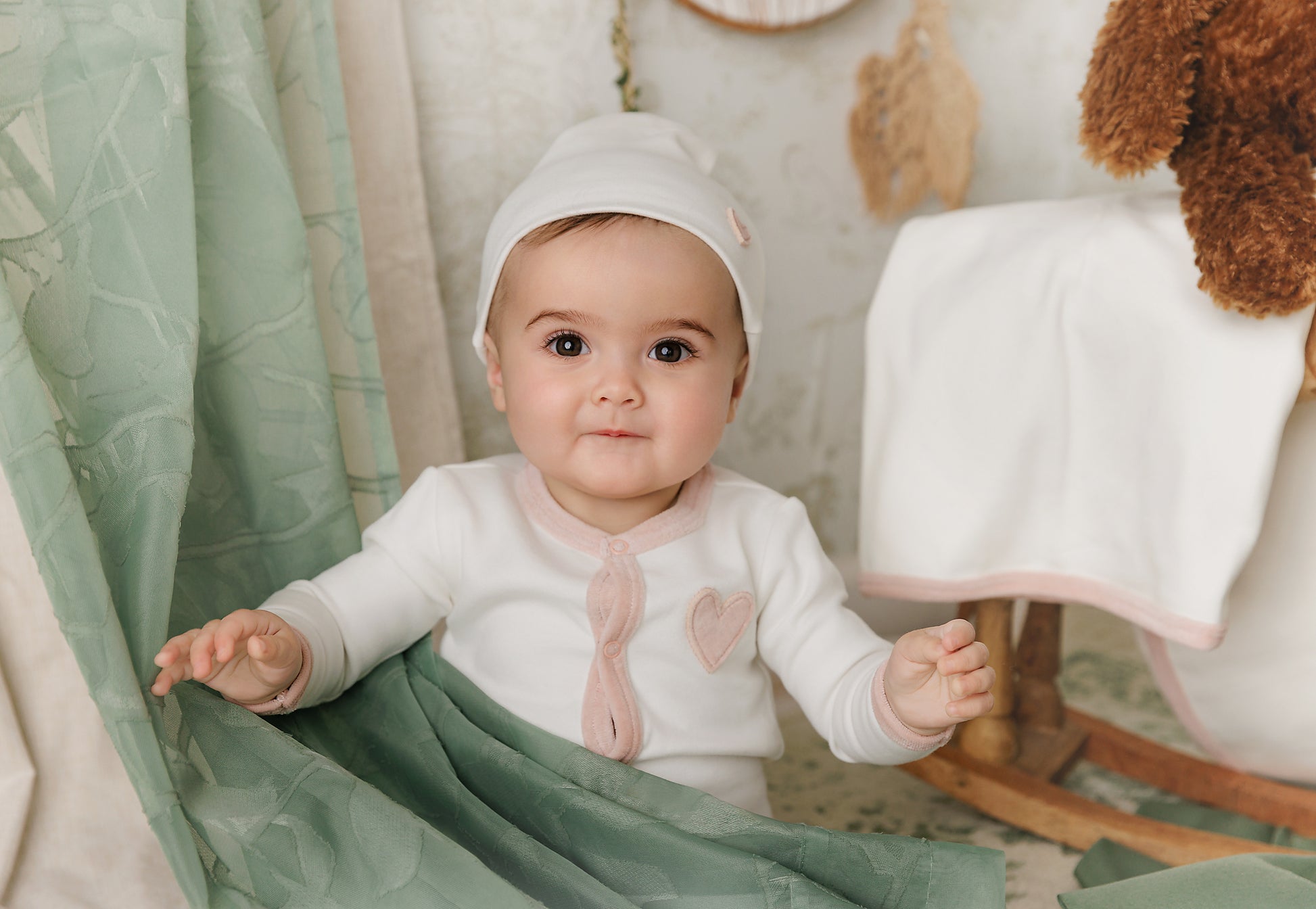 Wrap your baby in the soft luxury of the Mon Tresor Heart-Patch Footie & Hat Set. Made from premium cotton, this cozy footie features elegant velour trim for a gentle touch against delicate skin. The matching beanie keeps tiny heads warm and comfortable, making it perfect for all-day snuggles and sweet dreams. Ideal for gifting or everyday wear, this set combines comfort with charming design to keep your little one snug and stylish.