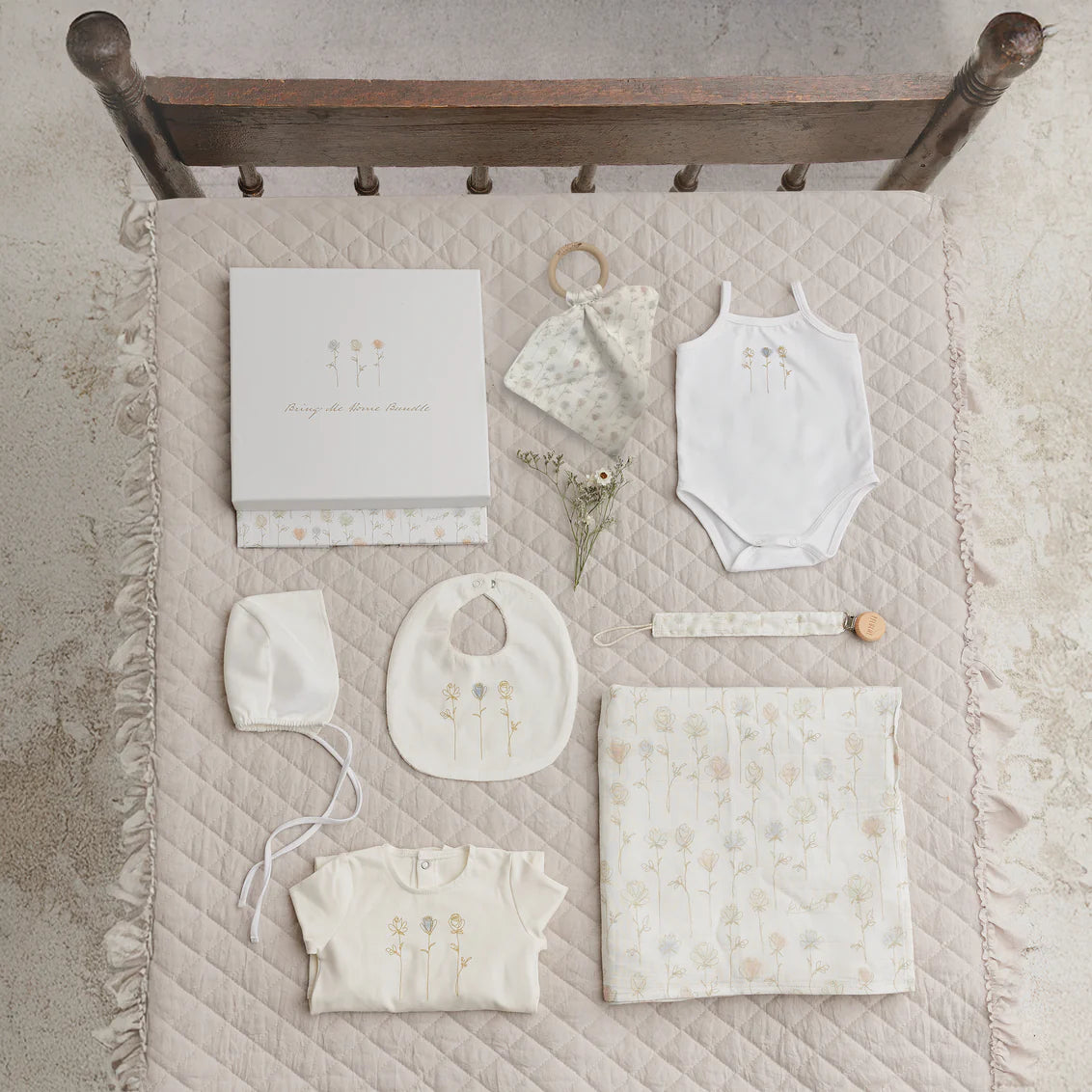 The Watercolor Bring Me Home Bundle Set is thoughtfully curated to surround your baby with comfort, beauty, and care from the very first days. Designed in soft watercolor tones, this complete collection brings together everything needed for those precious early moments at home and beyond. The set includes a cozy footie for all-day comfort, a delicate bonnet for timeless charm, and a lightweight swaddle to gently wrap your little one. Practical essentials like a paci clip and bib add convenience for parents, while a sweet onesie and matching ragdoll make the bundle even more special. Each piece is crafted from soft, breathable fabrics that are gentle on newborn skin, blending functionality with elegance. Perfect for hospital homecomings, newborn photos, or as a treasured gift, this bundle set creates a coordinated look that celebrates both beauty and practicality. With its thoughtful details and watercolor-inspired design, it’s a collection to be cherished from the very beginning.